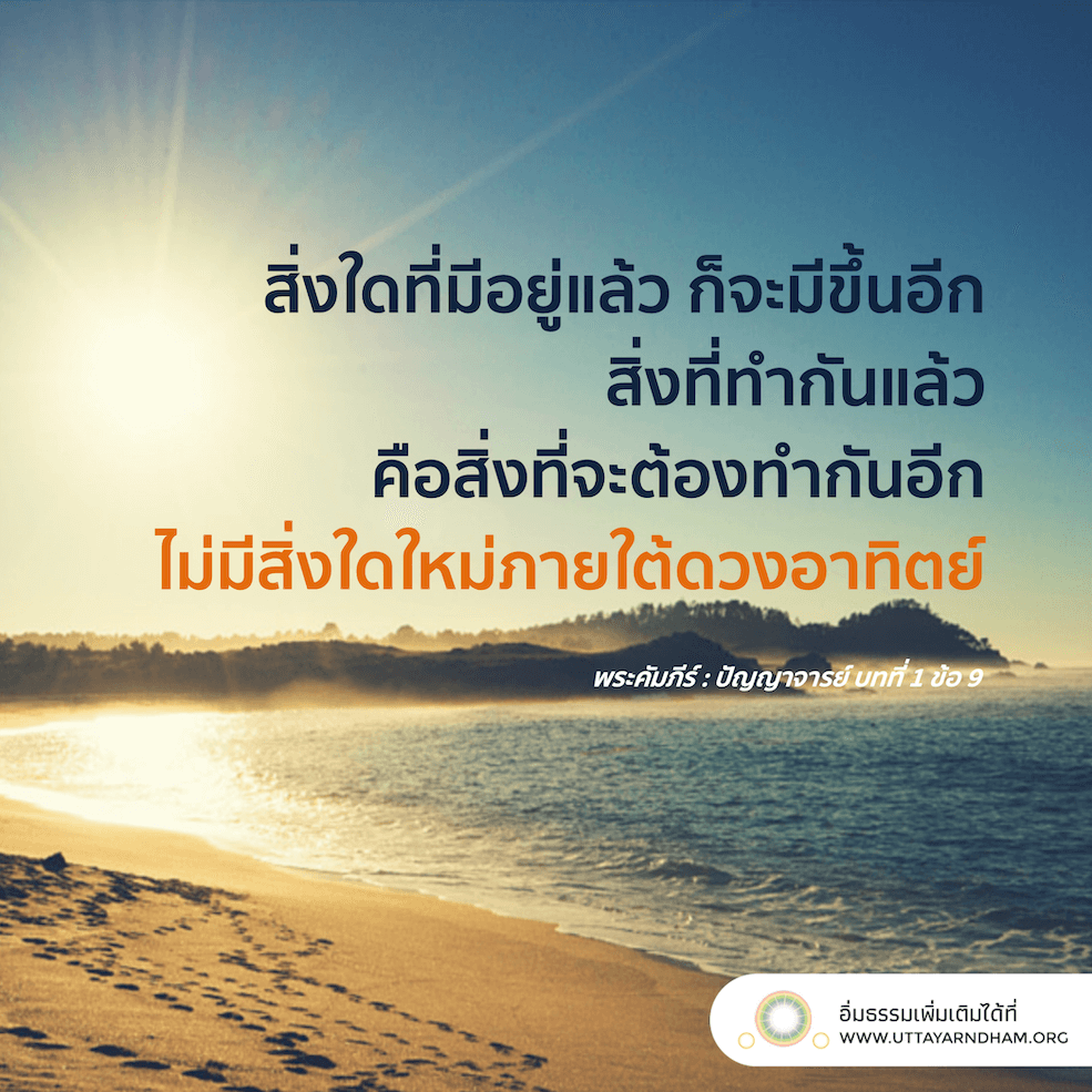 ไบเบิล - ไม่มีอะไรใหม่ในโลกนี้ สิ่งใดที่มีอยู่แล้ว ก็จะมีขึ้นอีก สิ่งที่ทำกันแล้ว คือสิ่งที่จะต้องทำกันอีก ไม่มีสิ่งใดใหม่ภายใต้ดวงอาทิตย์ พระสูตร: พระคัมภีร์ - ปัญญาจารย์ บทที่ 1 ข้อ 9