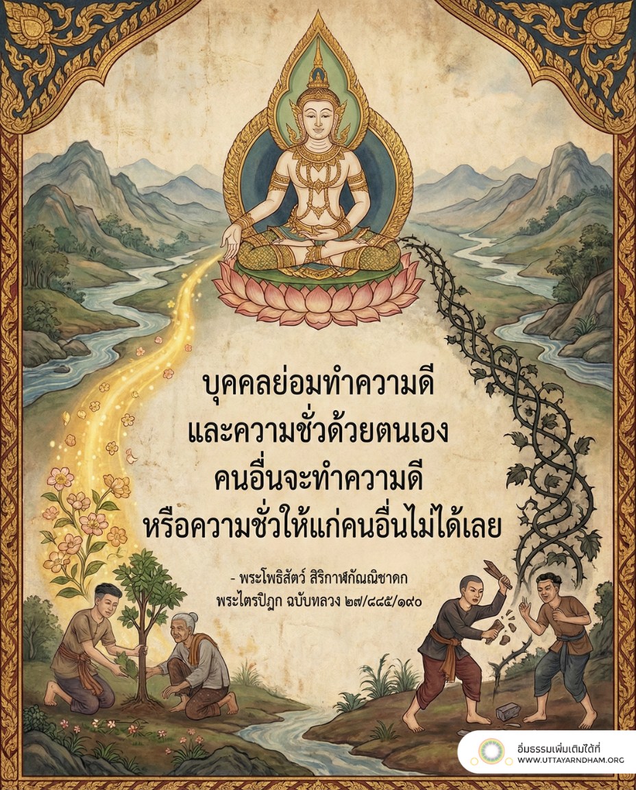 สิริเทพธิดากัณณิชาดก - การกระทำของตน บุคคลย่อมทำความดี และความชั่วด้วยตนเอง คนอื่นจะทำความดี หรือความชั่วให้แก่คนอื่นไม่ได้เลย พระสูตร: สิริกาฬกัณณิชาดก พระไตรปิฎก ฉบับหลวง ๒๗/๘๘๕/๑๙๐