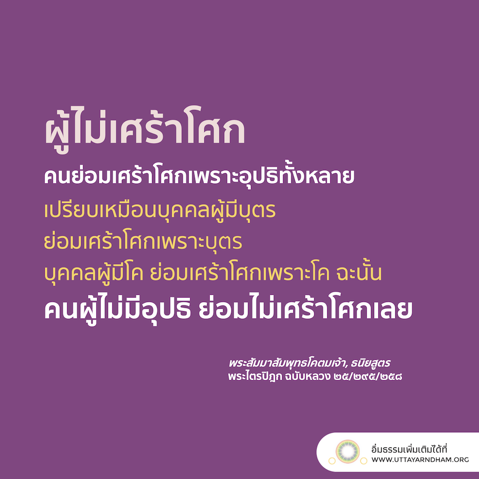 ธนิยสูตร - ผู้ไม่เศร้าโศก คนย่อมเศร้าโศกเพราะอุปธิทั้งหลาย เปรียบเหมือนบุคคลผู้มีบุตร ย่อมเศร้าโศกเพราะบุตร บุคคลผู้มีโค ย่อมเศร้าโศกเพราะโค ฉะนั้น คนผู้ไม่มีอุปธิ ย่อมไม่เศร้าโศกเลย พระสูตร: ธนิยสูตร พระไตรปิฎกฉบับหลวง ๒๕/๒๙๕/๒๕๘