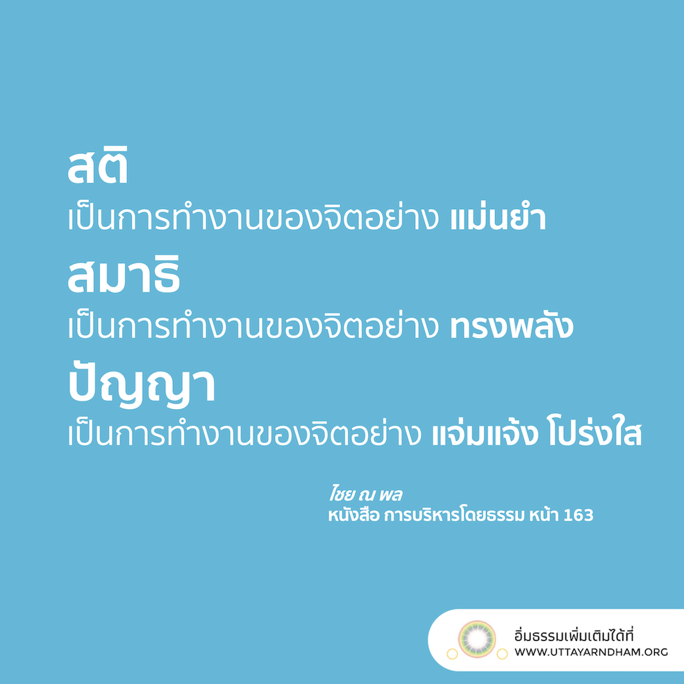 ไชย ณ พล - การทำงานของจิต สติ เป็นการทำงานของจิตอย่างแม่นยำ สมาธิ เป็นการทำงานของจิตอย่างทรงพลัง ปัญญา เป็นการทำงานของจิตอย่างแจ่มแจ้ง โปร่งใส (เดิม 1782) พระสูตร: การบริหารโดยธรรม หน้า 163